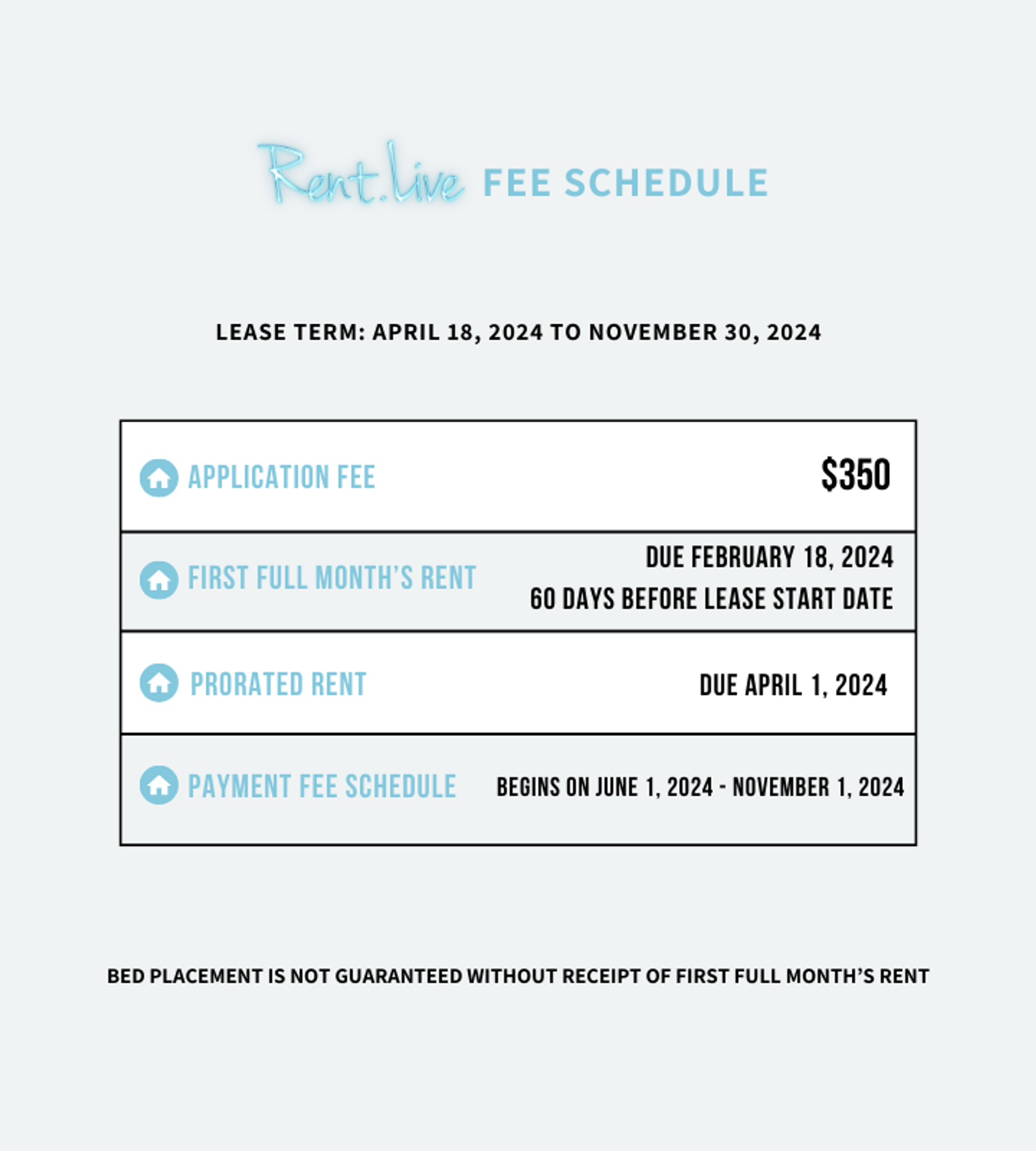 * Prorated rent for the lease start date is due on the 1st of the move-in month.